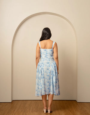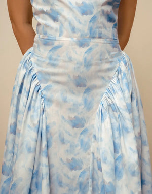 An exquisitely tailored cocktail dress that evokes the serene beauty of a cloudy sky. The structured, corseted bodice features elegant wide straps and a flattering square neckline. The waist is cinched, flowing into a dramatic, full A-line skirt with couture-level pleating that holds its voluminous shape. The fabric showcases a soft, abstract watercolor print in dreamy shades of powder blue and grey, making it an ideal choice for weddings or formal events. Tailored for the perfect getaway.